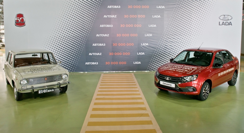 LADA под номером 30 000 000 выпущена в год 50-летия с момента сборки первого автомобиля в Тольятти – в связи с этим в церемонии принял участие и ВАЗ-2101.