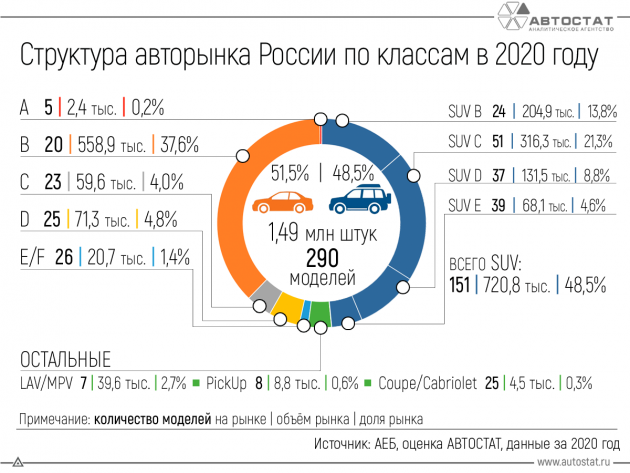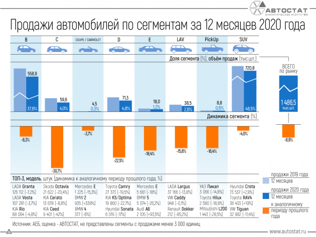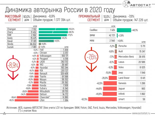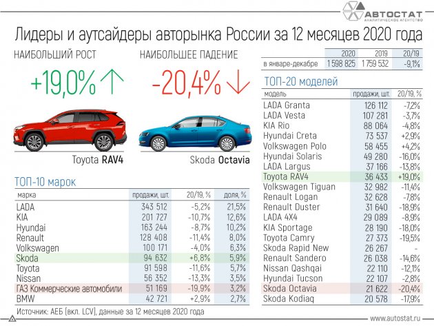 В 2020 году автомобильный рынок сократился на 9,1%. В 2020 году в январе–декабре было продано 1 598 825 автомобилей (LADA 343 512 шт.), что на 9,1% меньше (LADA - -5%), чем в 2019 году.