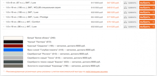 В настоящий момент цветовая гамма модели состоит из десяти цветов. Шесть из них - металлик, за которую ранее приходилось доплачивать 6000 руб. С 15 января доплата за металлик увеличилась на 3000 рублей и составляет 9000 рублей.