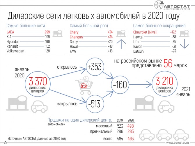 В 2020 году было открыто 5 дилерских центров LADA. Таким образом, на начало 2021 года в России насчитывается 300 автоцентров LADA. Основная часть (282 салона) обновлены по новым стандартам.