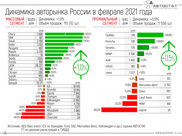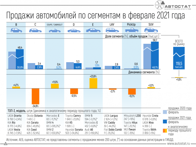 Ассоциация европейского бизнеса (АЕБ) опубликовала результаты продаж автомобилей в РФ за февраль 2021 года. В прошлом месяце в России было продано 120 081 легковых автомобилей (LADA - 28 272 шт.), что на 0,8% больше (LADA - +13%), чем в феврале 2020 года. Lada Granta вновь стала самым популярным автомобилем, опередив Kia Rio.