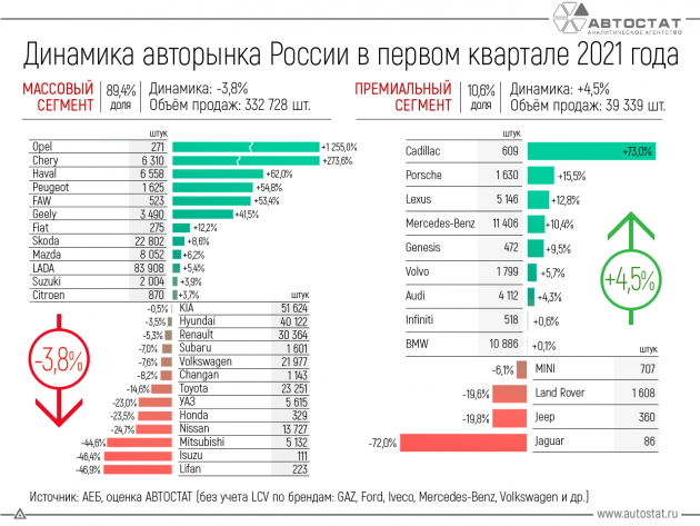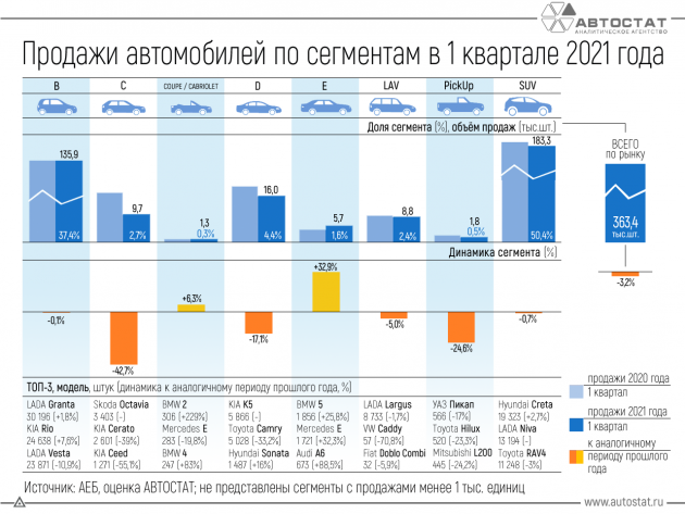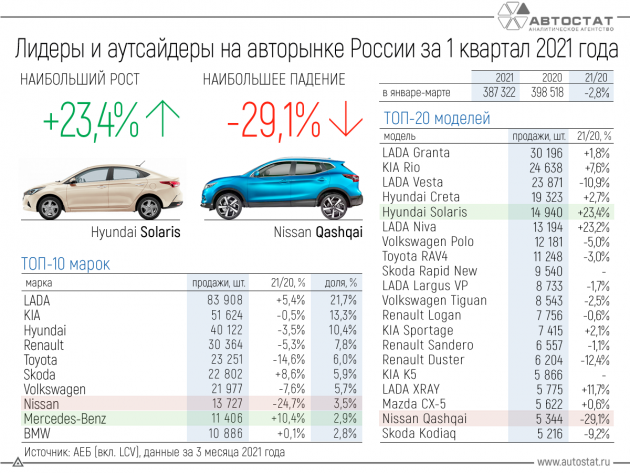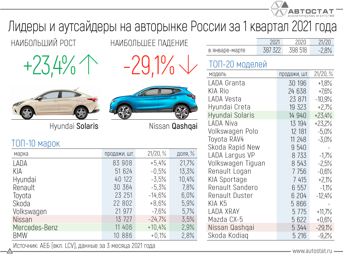 Ассоциация европейского бизнеса (АЕБ) опубликовала результаты продаж автомобилей в РФ за март 2021 года. В прошлом месяце в России было продано 148 676 легковых автомобилей (LADA - 33 779 шт.), что на 5,7% меньше (LADA - +3%), чем в марте 2020 года. Lada Granta стала самым популярным автомобилем месяца второй раз подряд.