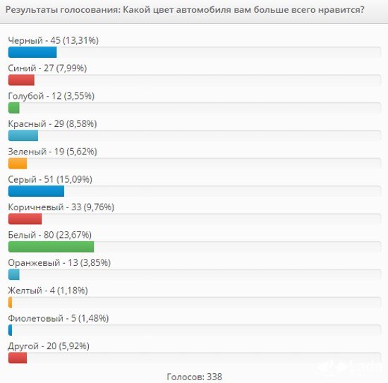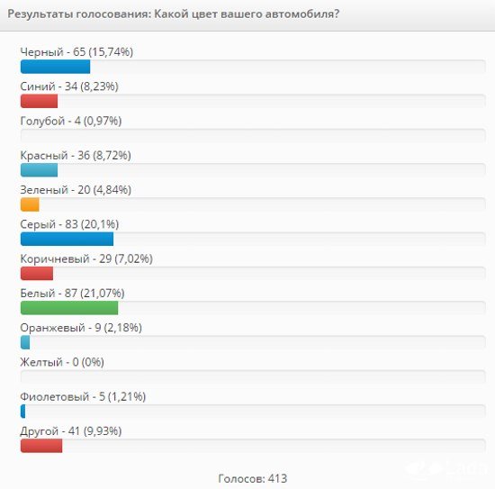 Согласно результатам опроса среди пользователей сайта лада.онлайн, самыми популярными цветами автомобилей являются: