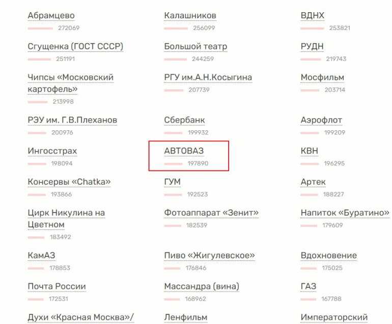 Из 50 лучших брендов АВТОВАЗ оказался в середине списка. Он опередил все другие автотранспортные бренды и встал в одном ряду с такими столпами российской жизни как Сбербанк, Аэрофлот, КВН, Артек.