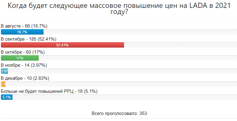 Напомним, в этом году АВТОВАЗ первый раз поднял стоимость на автомобили LADA 15 января (в среднем по всему модельному ряду прибавка в цене составила примерно 2-5%), затем 15 марта (прибавка в цене составила примерно 2%), 1 мая (+2%) и в июле (+2,43%).