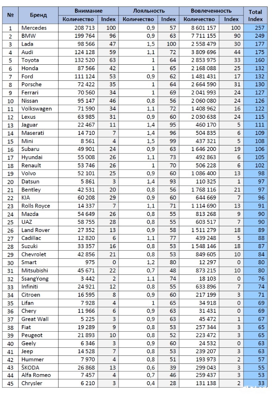 Источниками данных для анализа выступили публичные сообщения из России в социальных медиа: ВКонтакте, Facebook, Instagram, YouTube, Vimeo, G+, Мой Мир, МирТесен, а также многочисленные форумы и сайты отзывов. В апреле было отобрано 2,1 млн. содержательных сообщений, посвященных обсуждению и сравнению моделей, выбору нового автомобиля и опыту эксплуатации. В результате, был составлен рейтинг, основанный на интегральном индексе, учитывающем ключевые метрики – внимание, вовлеченность и лояльность медиаполя к бренду.