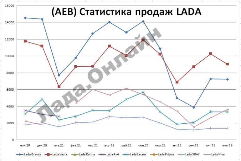 Ассоциация европейского бизнеса (АЕБ) опубликовала результаты продаж автомобилей в РФ за ноябрь 2021 года. В прошлом месяце в России было продано 125 446 легковых автомобилей (LADA - 26 373 шт.), что на 20,4% меньше (LADA - -31%), чем в ноябре 2020 года. Лидером продаж четвертый месяц подряд становится семейство Lada Vesta.