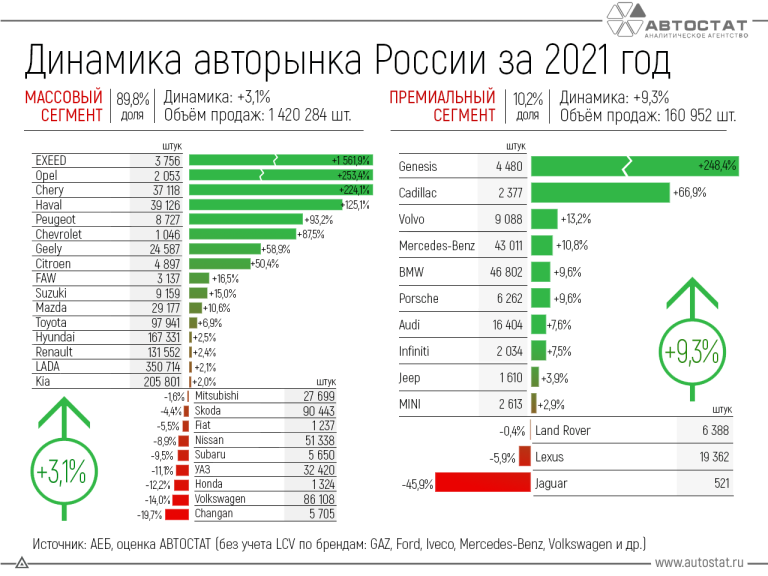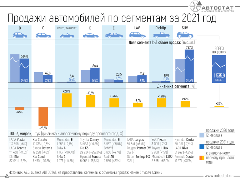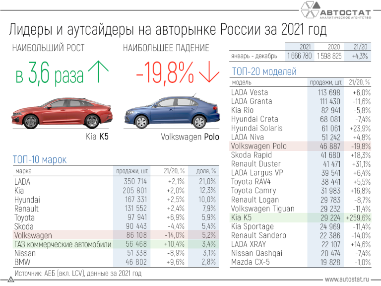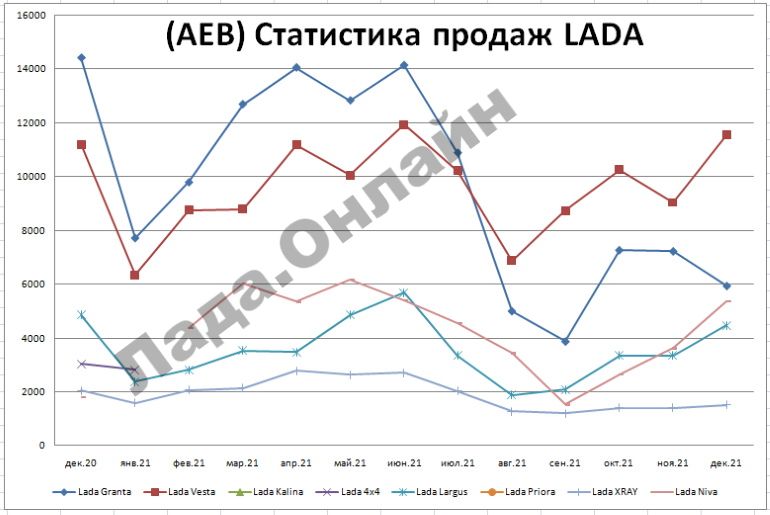 Ассоциация европейского бизнеса (АЕБ) опубликовала результаты продаж автомобилей в РФ за декабрь и за 12 месяцев 2021 года. В прошлом месяце в России было продано 133 470 легковых автомобилей (LADA - 29 919 шт.), что на 19,9% меньше (LADA - -27%), чем в декабре 2020 года. В 2021 году в январе – декабре всего было продано 1 666 780 автомобилей (LADA - 350 714 шт.), это на 4,3% больше (LADA - +2%), чем в 2020 году. Лидером продаж пятый месяц подряд становится семейство Lada Vesta. Эта модель стала самой популярной и по итогам 2021 года.