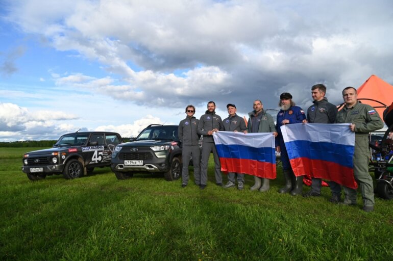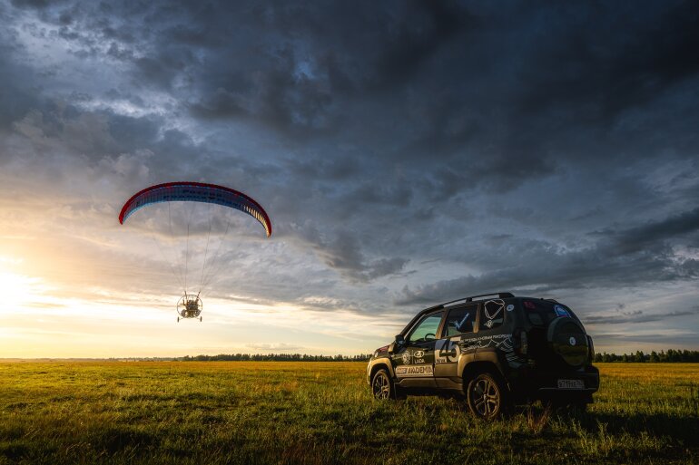 Обн.09.06.2022: Путешественник Фёдор Конюхов и мастер спорта Игорь Потапкин при наземной поддержке автомобилей LADA NIVA установили новый мировой рекорд дальности беспосадочного полёта на мотопараплане.