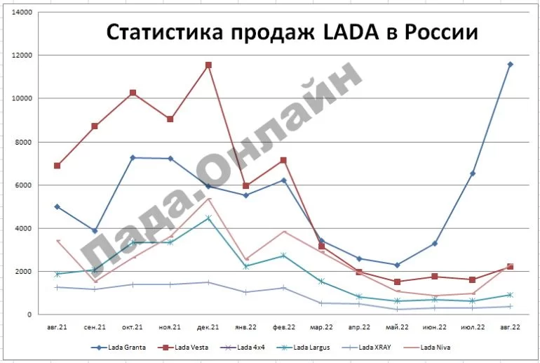 Всего же в августе 2022 года в России продано 18 087 легковых и легких коммерческих моделей LADA, что на 75,2% выше, чем в июле 2022 года. Таким образом, августовские продажи LADA автомобилей всего двух семейств (Granta и NIVA) практически вышли на уровень 2021 года, когда выпускалась линейка из 5 моделей.