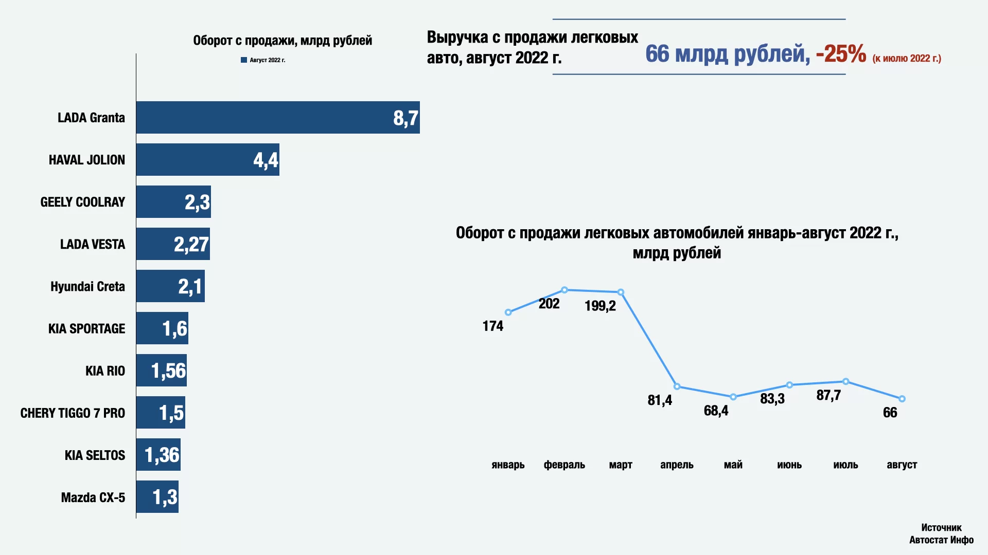 По данным «Автостат Инфо», в августе 2022 года авторитейлеры выручили с продажи легковых автомобилей почти 66 млрд рублей. Это на 24,8% меньше, чем было получено в июле этого года — 87,7 млрд рублей. Наибольшую выручку принесла Lada Granta.