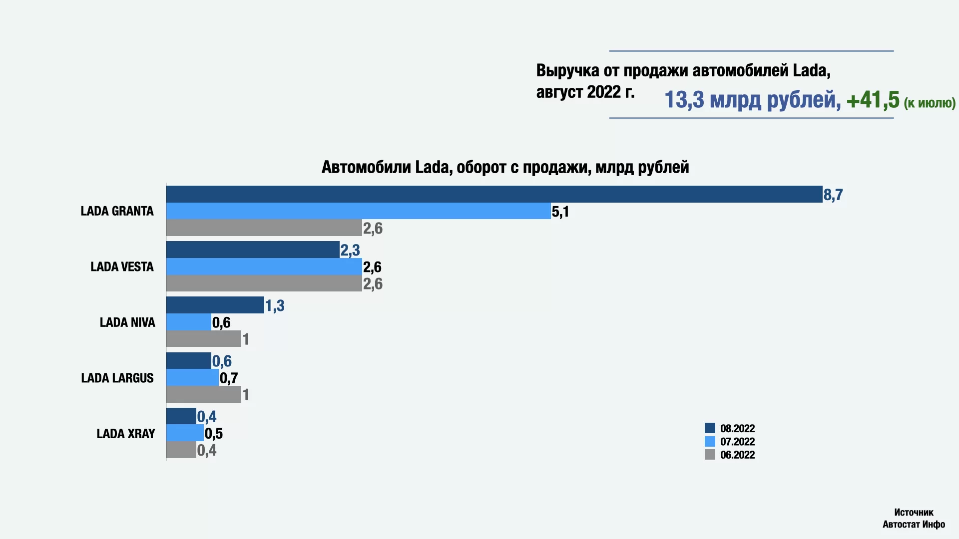 Отмечается, что в августе с продажи автомобилей LADA в России была получена выручка в размере 13,3 млрд рублей. Это на 41,5% больше оборота с продаж за июль 2022 года — 9,4 млрд рублей.