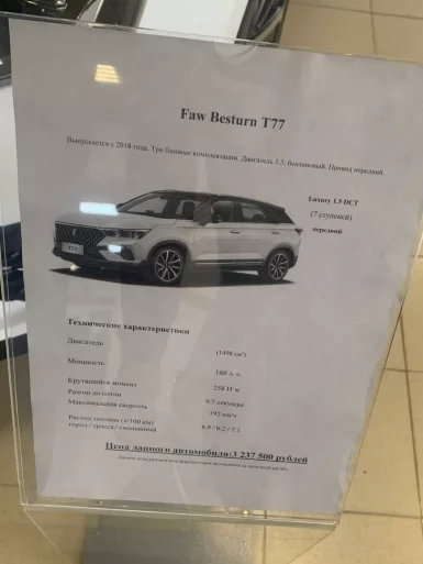 Цены пока не определены. Стоит отметить, что FAW Bestune T77 уже продается в России по цене от 2 169 000 рублей.
