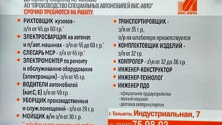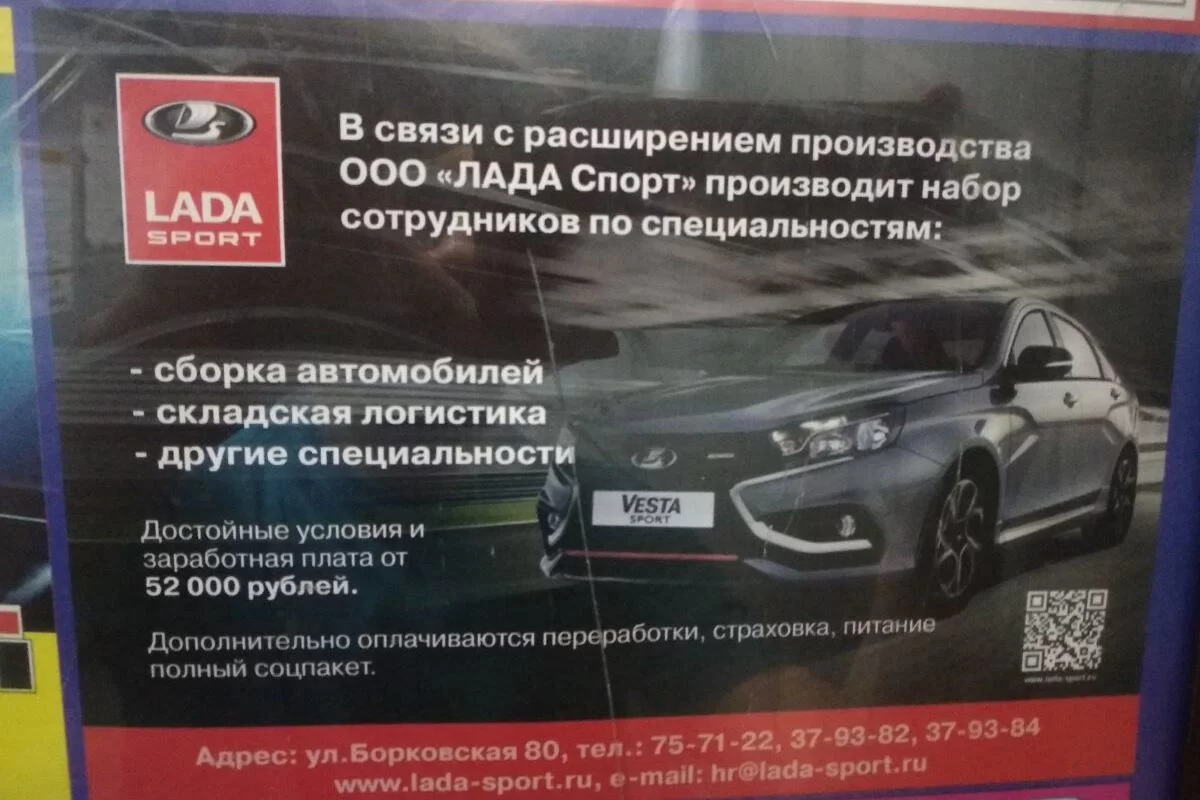Также ведется набор на предприятие LADA Sport (дочернее подразделение АВТОВАЗа), где собирают спортивные версии автомобилей LADA. Ведется набор сотрудников по специальностям: сборка автомобилей, складская логистика и др.специальности. Заработная плата в этом подразделении от 52 000 рублей.