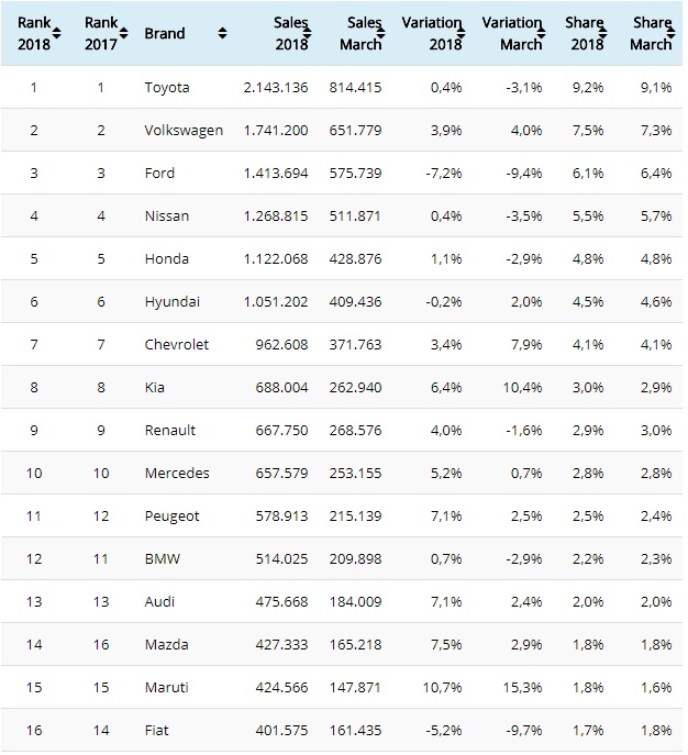 Портал focus2move опубликовал статистику продаж автомобилей в мире за первый квартал 2018 года. Возглавляет рейтинг японский бренд Toyota. Российская Lada по итогам трех месяцев года расположилась на 50-й позиции. Аналогичное место в списке этот бренд занимал и годом ранее.