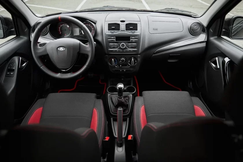 Интерьер LADA Granta Sport отличается специальной контрастной отделкой. Сиденья с выраженной боковой поддержкой обеспечивают комфорт водителя и пассажира при энергичном маневрировании. Кожаная оплетка руля помогает надежно удерживать обод при активном вождении, а красная нулевая отметка способствует более точному управлению на специальных трассах. Традиционный для автоспорта красный цвет применяется и в оформлении комбинации приборов, и на молдингах бамперов.