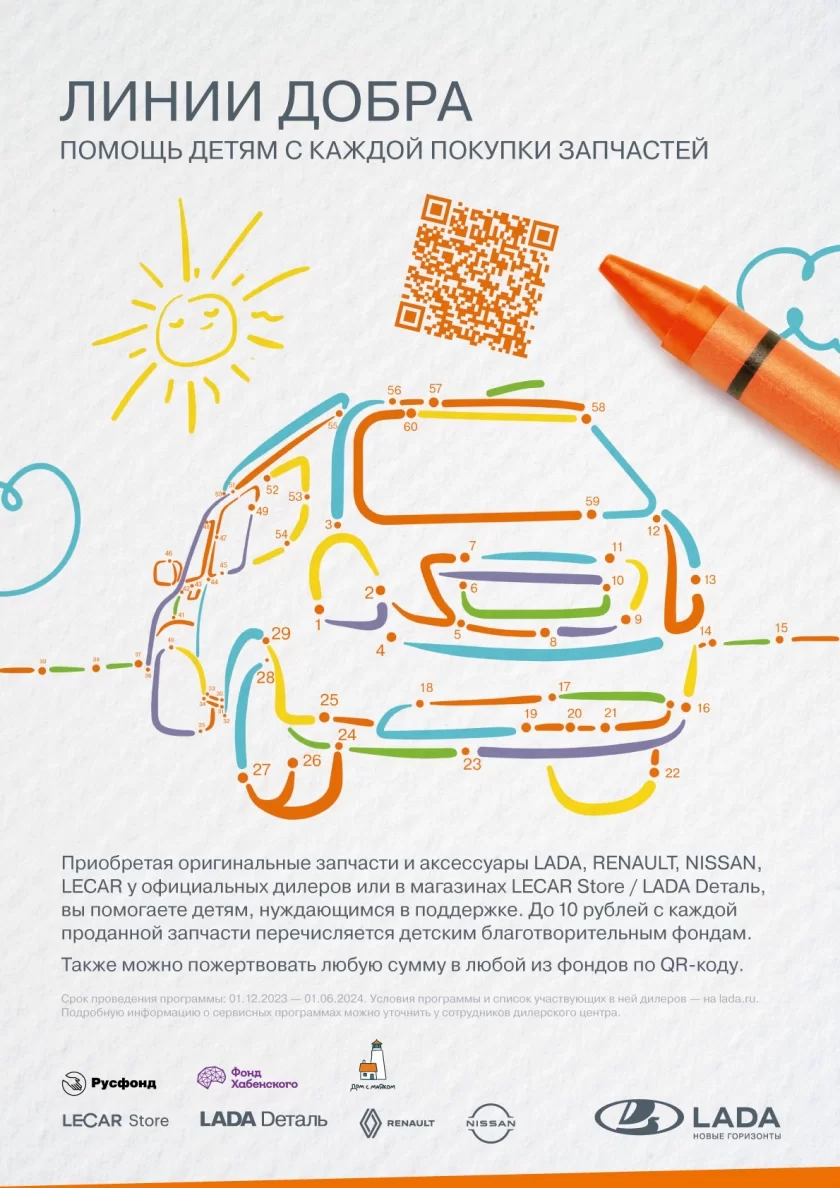 Приобретая оригинальные запасные части и аксессуары LADA, RENAULT, NISSAN и LECAR у официальных дилеров или в розничных магазинах LADA Dеталь / LECAR Store, владельцы автомобилей помогают детям с тяжелыми заболеваниями. С каждой покупки в адрес фондов перечисляется до 10 рублей.