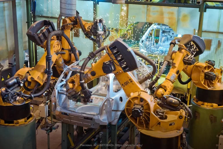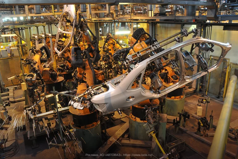 Процесс сварки кузова на АВТОВАЗе автоматизирован. На этом этапе производства задействовано более 380 сварочных роботов. Человек здесь только помогает роботу, подает ему детали, фиксирует их, а дальше машина сама сваривает кузов. На каждом кузове – около 5 тысяч сварочных точек.