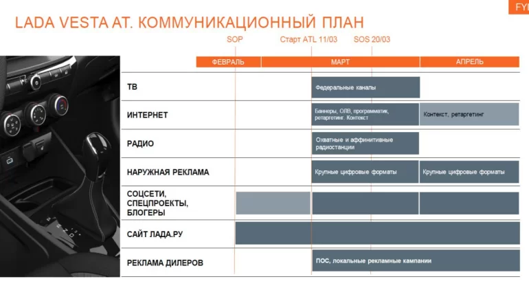 Кроме этого был представлен коммуникационный план, который наглядно показывает, что АВТОВАЗ намерен активно рекламировать обновленную Весту с новой автоматической трансмиссией не только на официальном сайте и в автоцентрах, но и на ТВ, на радио, в интернете, в социальных сетях и на билбордах городов.