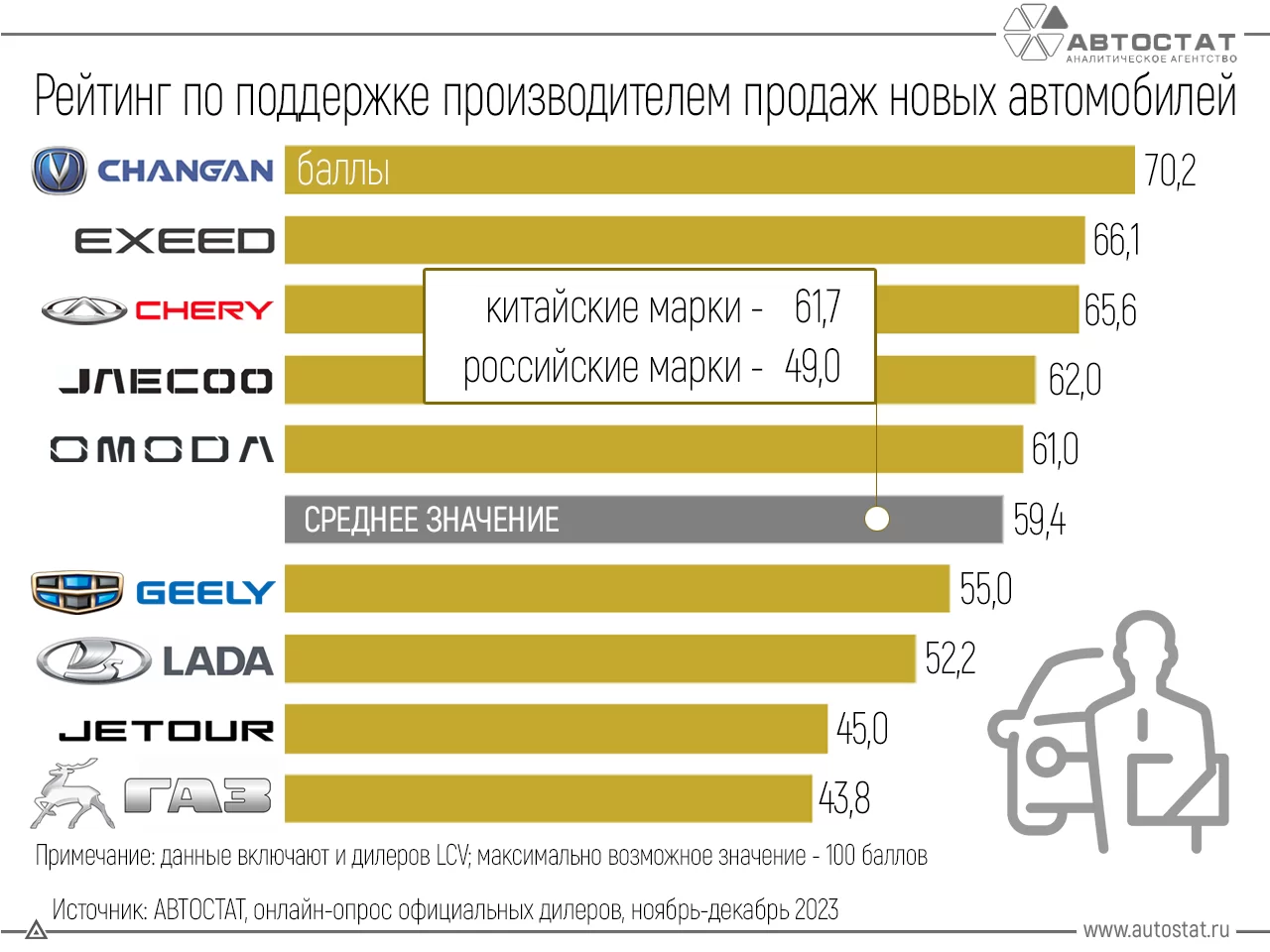 Так, в целом по рынку данный показатель составил 59,4 балла. При этом у китайских брендов он выше, чем у российских (61,7 и 49 баллов соответственно).