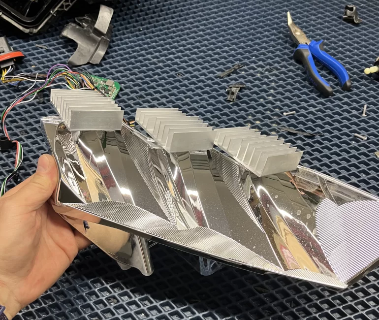Сзади располагается драйвер чипов поворотника. Зазор между светодиодами и трубками составляет 1,5мм, что достаточно много и здесь вряд ли будет встречаться поджарка торца световода, чем болеют многие другие автомобили.
