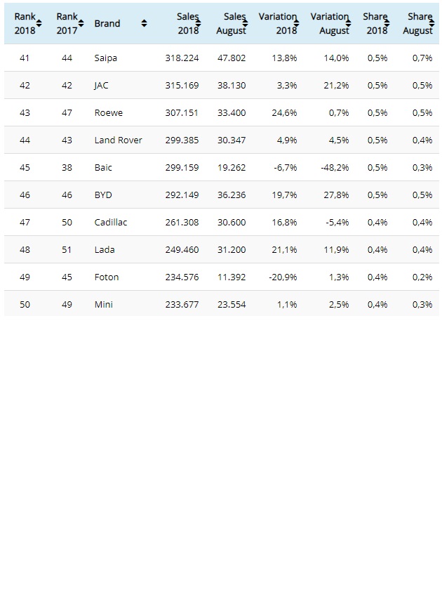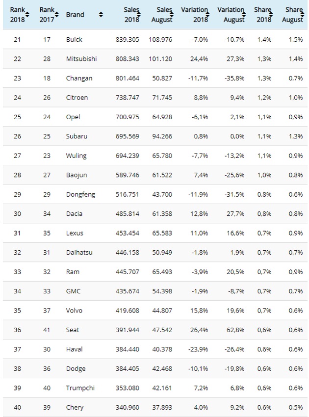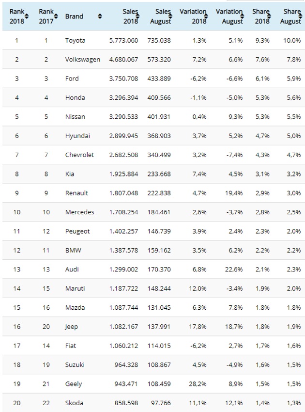 Портал focus2move опубликовал статистику продаж автомобилей в мире за август 2018 года. Возглавляет рейтинг японский бренд Toyota. Российская LADA расположилась на 48-ом месте рейтинга, улучшив позицию на две строчки (по сравнению с аналогичным периодом 2017 года).
