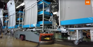 2. Цех сборки Лада Гранта, участок интерьера. Здесь также работала KAIZEN команда. Однако в конструкции применили принципы каракури, тележка с комплектующими попадает к линии при помощи самоходной HGV, а дальше цепляется за линию напольного конвейера и продолжает сопровождать автомобиль по всему пути сборки, без использования дополнительных приспособлений и механизмов.