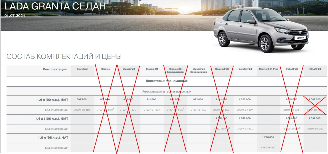 АВТОВАЗ с начала июля пересмотрел прайс-листы семейства Lada Granta. Из прайсов убрали комплектации 2023 года, а также некоторые базовые версии исполнения, что изменило стартовую стоимость модели. У комплектаций появилась пометка «не производится».