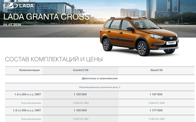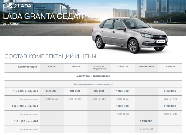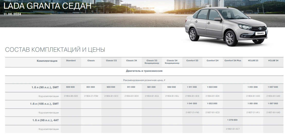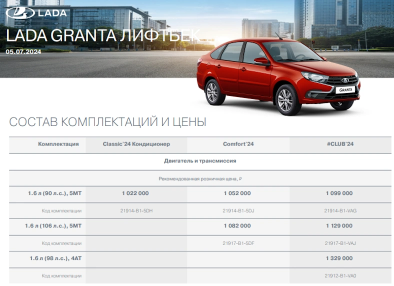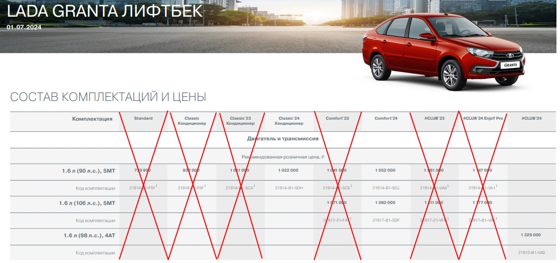 Лифтбек Lada Granta. Убрали версии 2023 года, а также комплектации Standart и Classic Кондиционер. Теперь самый доступный лифтбек - это Classic'24 Кондиционер за 1 022 000 рублей (увеличилась на 282,1 тыс.р.).