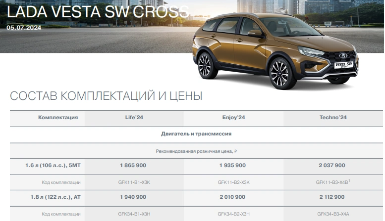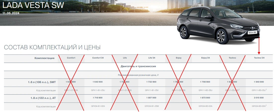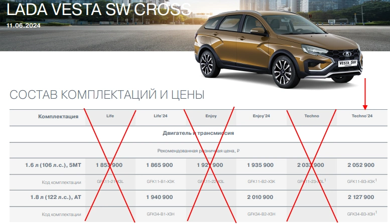 Lada Vesta SW Cross. Не выпускают Life и Enjoy. Стартовая цена теперь 1 865 900р (дороже на 12 тыс.р.). Возобновили производство Techno'24, которая стала дешевле на 15 тысяч рублей.