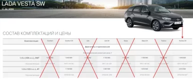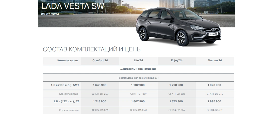 Lada Vesta SW. Больше не выпускают версию Comfort, Life, Enjoy. Цены на универсал теперь начинаются с отметки 1 643 900 рублей (всего на 4 тыс. дороже). Возобновили производство Techno'24, которая стала дешевле на 20 тысяч рублей.