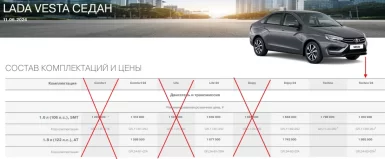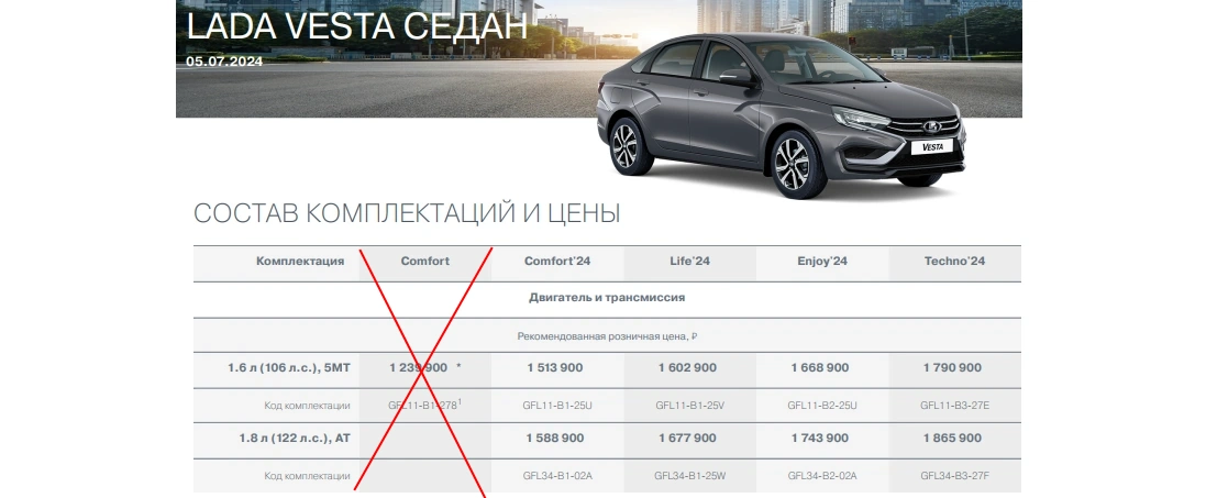 Lada Vesta седан. Перестали производить Comfort, Life и Enjoy. Возобновили производство Techno'24, которая стала дешевле на 20 тысяч рублей.