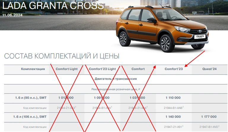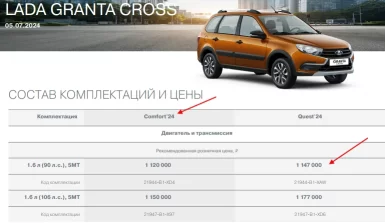 В начале июля АВТОВАЗ пересмотрел комплектации Lada Granta Cross. Из пяти комплектаций на заводе стали производить только две: Comfort'24 и Quest'24. Кроме этого на заводе изменили состав опций и цены на эту модификацию автомобиля. Сайт Лада.Онлайн разобрался во всех изменениях.