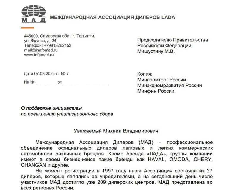 Официальные дилеры АВТОВАЗа направили коллективное письмо в адрес правительства РФ, в котором выразили поддержку планам кабмина резко повысить утилизационный сбор на автомобили. Обращение поступило от имени Международной ассоциации дилеров (МАД) — эта некоммерческая организация объединяет продавцов Lada.