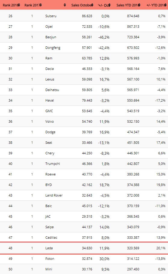 Портал focus2move опубликовал статистику продаж автомобилей в мире за десять месяцев 2018 года. Возглавляет рейтинг японский бренд Toyota. Российская LADA расположилась на 48-ом месте рейтинга. В период с января по октябрь отечественная марка реализовала на глобальном рынке 320 569 автомобилей.