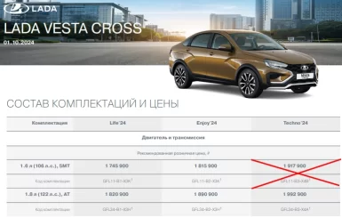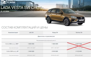 Из прайсов модели Lada Vesta седан Cross и Lada Vesta SW Cross исключили версию исполнения Techno'24 с силовым агрегатом 1.6 л (106 л.с.) и 5МТ. Ранее их рекомендованная розничная цена была 1 917 900 и 2 037 900 рублей соответственно.