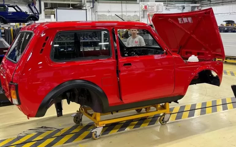 Обн.05.12.2025: На конвейере «Лада Спорт» засняли внедорожник Niva Sport в новом красном цвете.