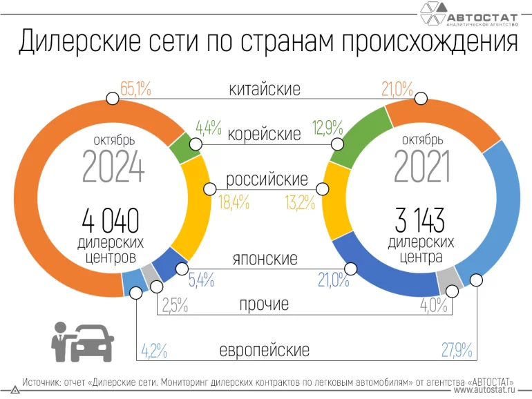 По состоянию на октябрь 2024 года в нашей стране работало 4040 официальных дилерских центров. Для сравнения: этот показатель почти на 900 автоцентров больше, чем в октябре 2021-го (3143). То есть за прошедшие три года число дилеров выросло на 28,5%.