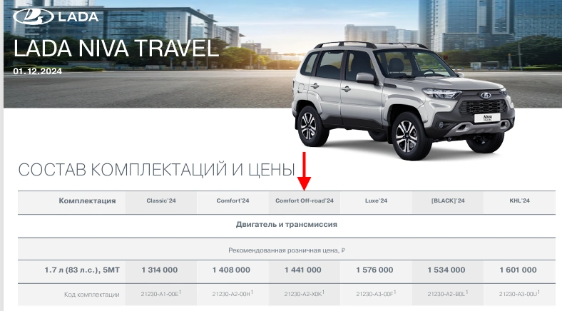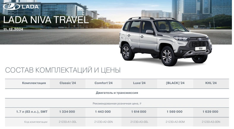 В конце ноября 2024 года АВТОВАЗ возобновил производство LADA NIVA Travel с подушками безопасности и ЭРА-ГЛОНАСС. На днях обновленные прайс-листы внедорожника появились на официальном сайте LADA. Кроме объявленных изменений из списка комплектаций убрали версию Off-road.