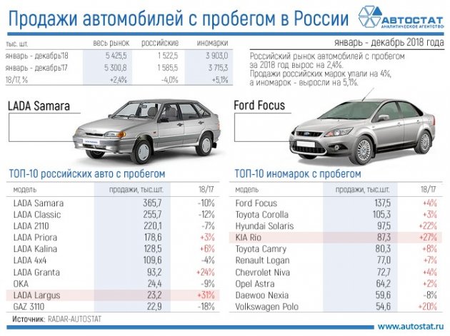 Аналитическое агентство «АВТОСТАТ» провело исследование российского автомобильного рынка. В результате был составлен рейтинг продаж легковых автомобилей с пробегом за 2018 год. Лидером этого рынка традиционно является отечественная марка LADA.