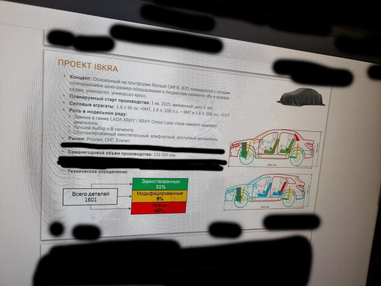 Блогер KhaDm опубликовал снимок «ПРОЕКТ ISKRA», на котором указано, что эта модель будет состоять из 1601 детали. Половина из них (51%) — это заимствованные запчасти, 40% — новые, а 9% — модернизированные.