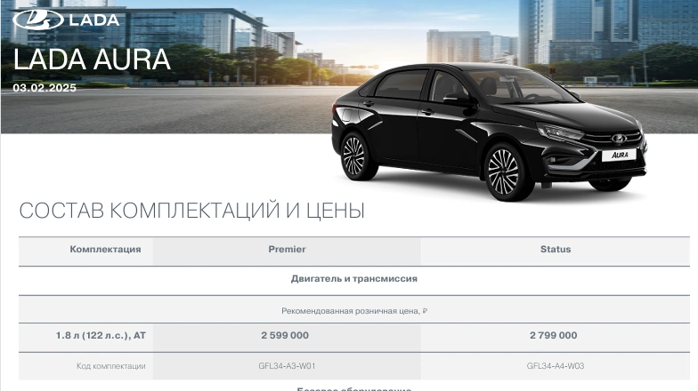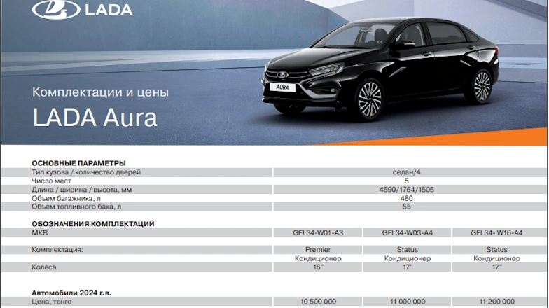 На официальном сайте LADA в Казахстане указывается, что РРЦ Lada Aura в комплектации Premier составляет 10 500 000 тг (в пересчете 1 987 500 рублей). В России аналогичная версия исполнения бизнес-седана предлагается по цене 2 599 000 ₽, что на 611 500 рублей дороже.