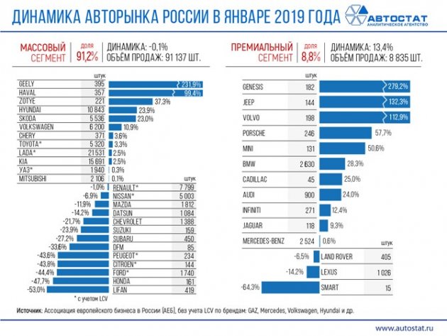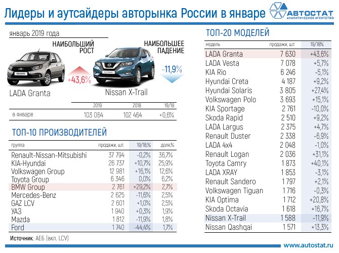 Ассоциация европейского бизнеса (АЕБ) опубликовала результаты продаж автомобилей в РФ за январь 2019 года. В этом месяце года в России было продано 103 064 легковых автомобилей (LADA - 21 531 шт.), что на 0,6% (LADA - +3%) больше, чем в январе прошлого года. Самым популярным автомобилем месяца стала модель Lada Granta.