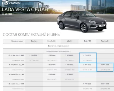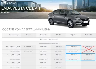 Стоит отметить, что из прайсов седанов убрали комплектацию Techno'24 с силовым агрегатом 1.6л и МКП5. В пресс-службе АВТОВАЗа сообщили сайту Лада.Онлайн, что этот силовой агрегат заменили на 1.8л+6МТ. Топовой версии — топовый силовой агрегат.