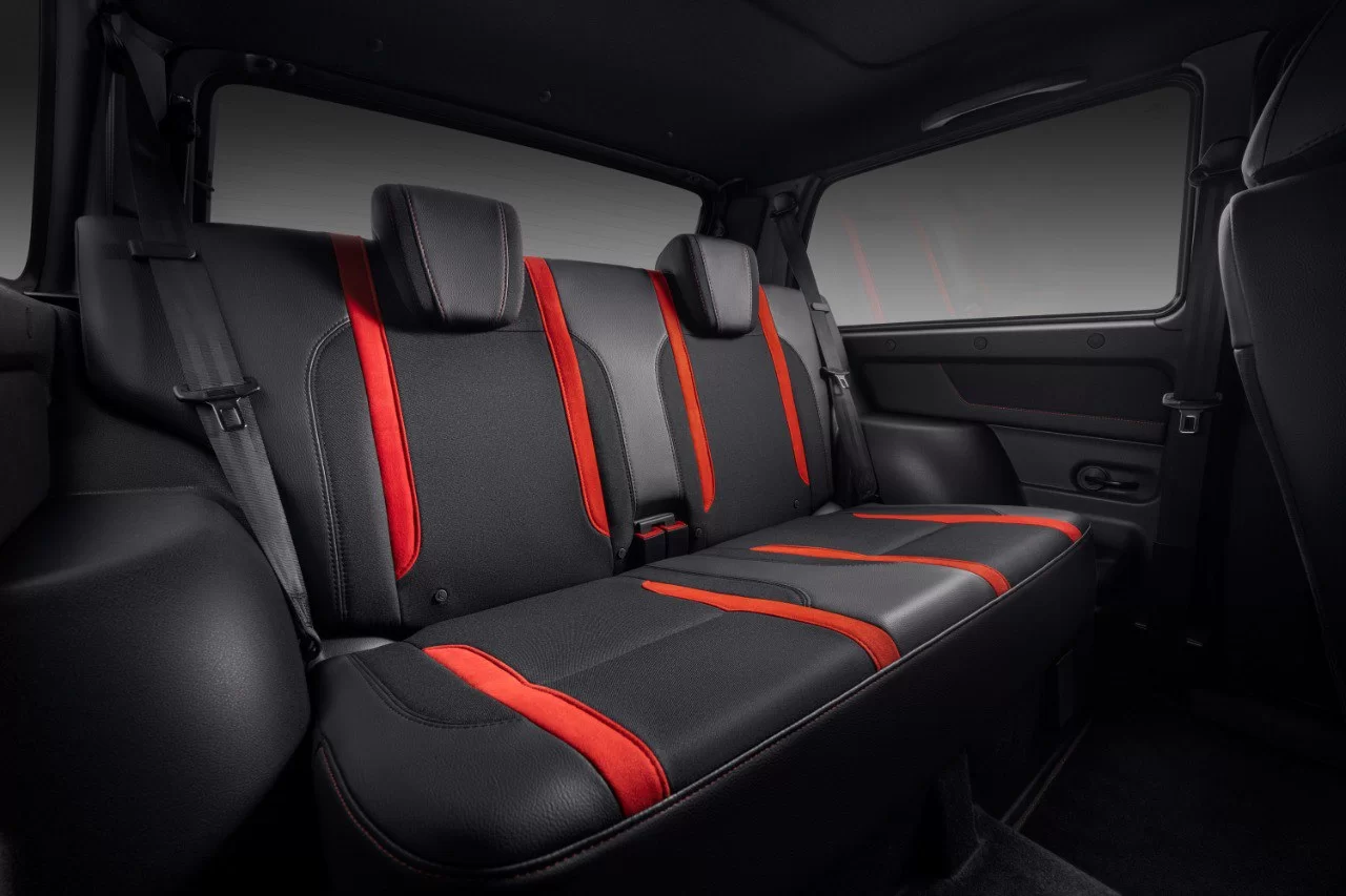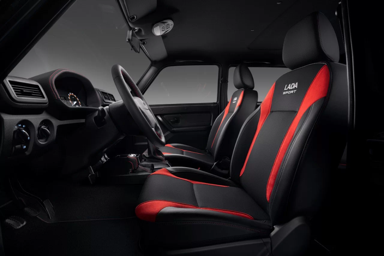 Салон оформлен в черно-красных тонах с логотипами LADA Sport на сиденьях. Эргономика адаптирована к скоростному вождению: рулевая колонка регулируется по наклону, рулевое колесо обшито кожей. Раздаточная коробка оснащена однорычажным приводом.
