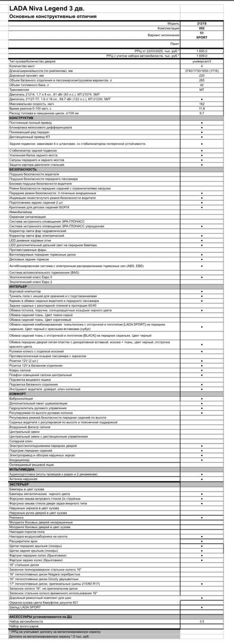 Рекомендованная розничная цена LADA NIVA Sport — от 1 699 000 рублей. Продажи стартуют 5 апреля 2025 года, в день рождения легендарного внедорожника.
