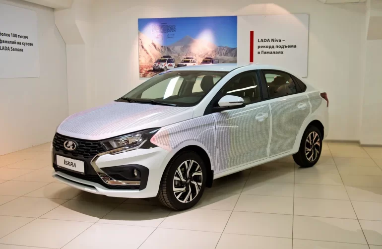 Белый седан LADA Iskra стал символичным подарком коллективу завода: на его бортах нанесены более 37 000 фамилий сотрудников, работавших на предприятии АО «АВТОВАЗ» по состоянию на начало 2025 года. Для удобства поиска использован крупный шрифт, а каждое подразделение выделено отдельным цветом — это позволяет быстро найти свою фамилию, а также фамилии коллег, родственников и друзей.