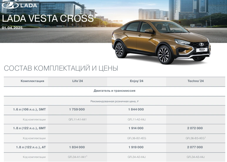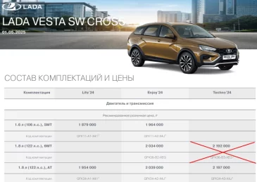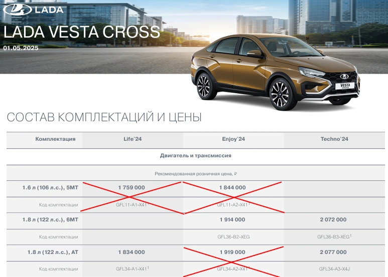 Больше не производят седаны Cross Life'24 и Enjoy'24 1.6 л (106 л. с.), 5МТ за 1 759 000 и 1 844 000, а также 1.8 л (122 л. с.), АТ за 1 919 000 рублей.