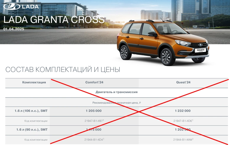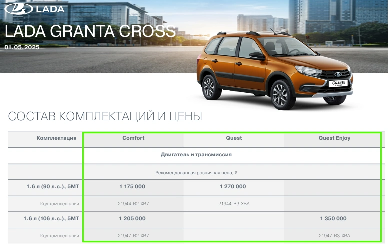 У Кросс версии тоже пересмотрены версии исполнения. Вместо Comfort'24 и Quest'24 появились Comfort, Quest и Quest Enjoy. Отличие последних в силовом агрегате и опциях, Quest Enjoy получила дополнительно камеру заднего вида, а вместо простой аудиосистемы используется мультимедийная система LADA EnjoY Pro с встроенными сервисами Яндекс.Авто 7''.