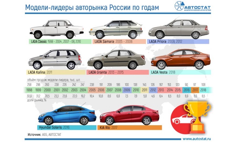 Специалисты аналитического агентства «АВТОСТАТ» составили рейтинг самых продаваемых новых автомобилей в России, начиная с 1998 года. До 2015 года включительно самые продаваемые модели принадлежали одному бренду – отечественной LADA. Но конкуренция со стороны иномарок усиливалась. В 2016 году лидером нашего рынка впервые стал Hyundai Solaris, а год спустя его в этом звании сменил KIA Rio.